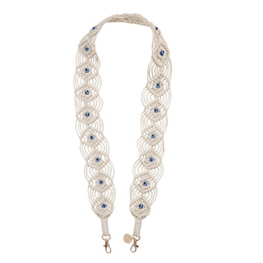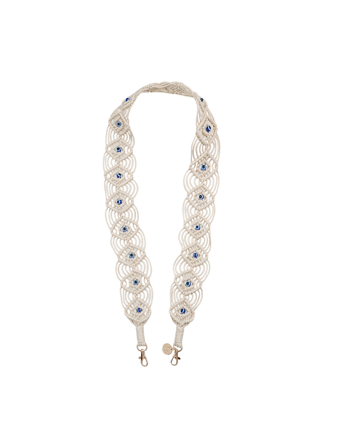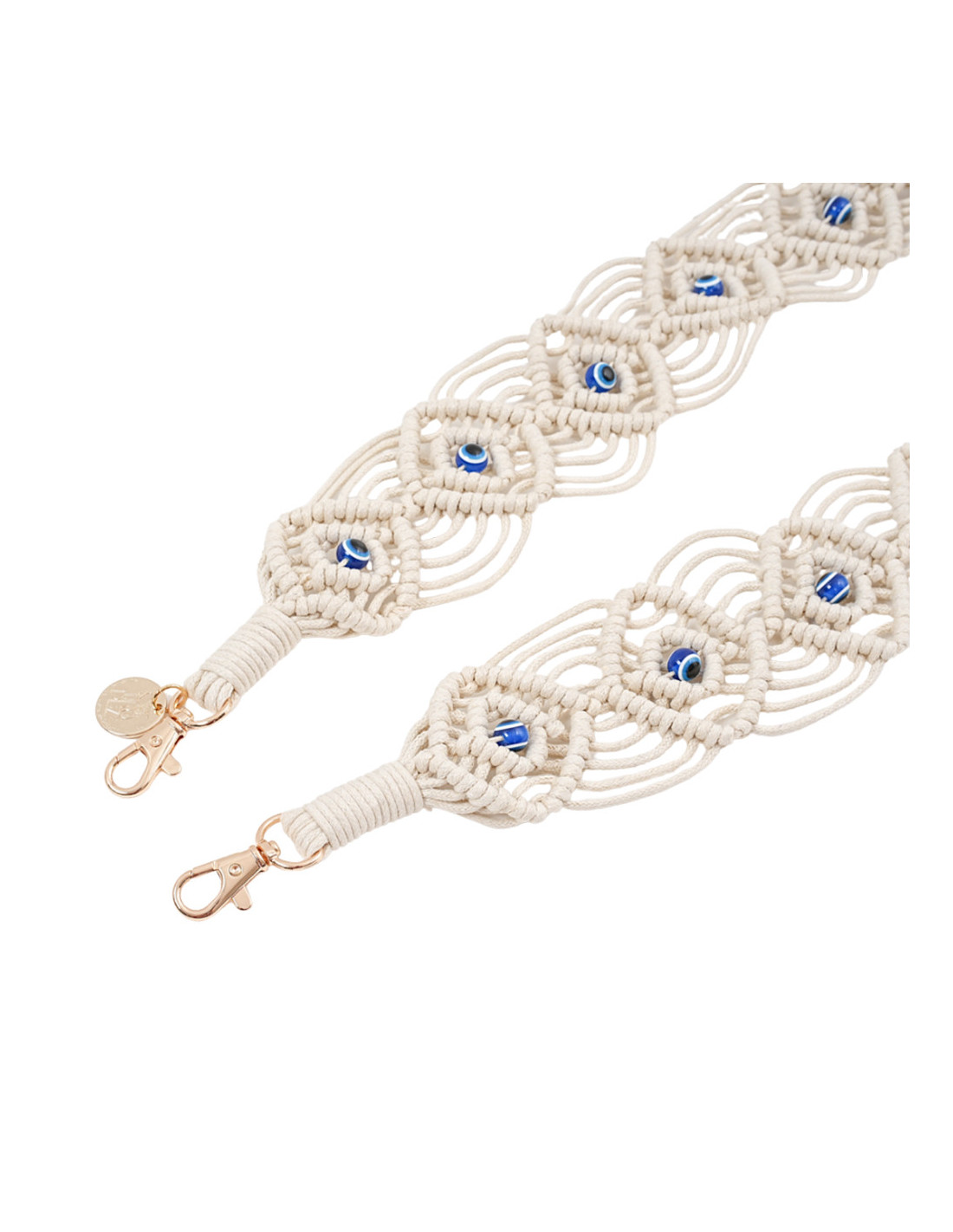 - Signature detail: macramé strap embellished with evil-eye beads.