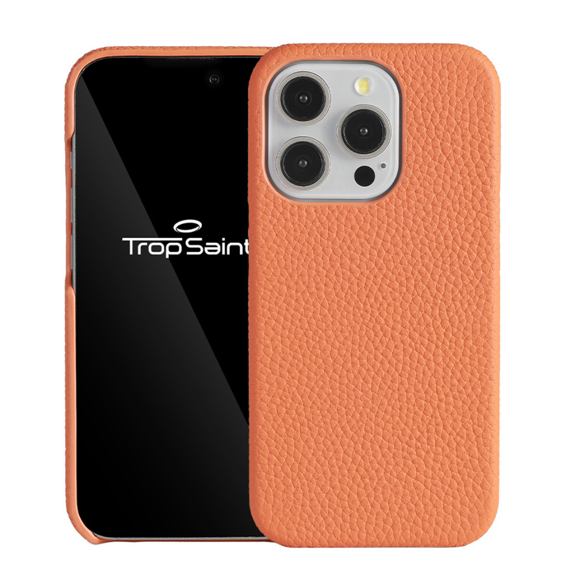 Coque orange en cuir grainé (style litchi), élégante et tendance, offrant une protection fine et un toucher premium. Compatible MagSafe pour utiliser chargeurs et accessoires aimantés. Un look orange moderne parfait pour iPhone. Pour une protection complète, ajoutez un verre trempé 3D ou un verre trempé anti-espion.