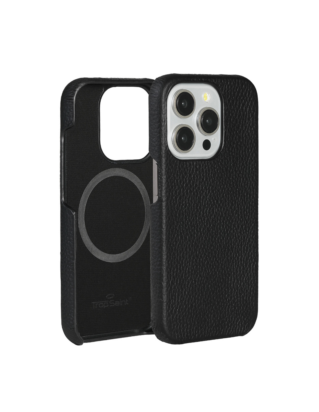 Coque noire en cuir grainé (style litchi), élégante et tendance, offrant une protection fine et un toucher premium. Compatible MagSafe pour utiliser chargeurs et accessoires aimantés. Un look moderne parfait pour iPhone. Pour une protection complète, ajoutez un verre trempé 3D ou un verre trempé anti-espion.